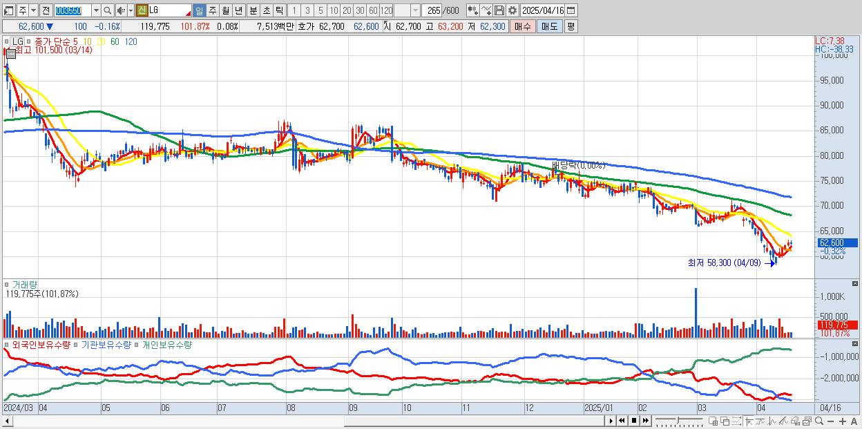 - LG (62,700원 0% , 시총: 98,628억, 외국인 순매수 거래금:25억)