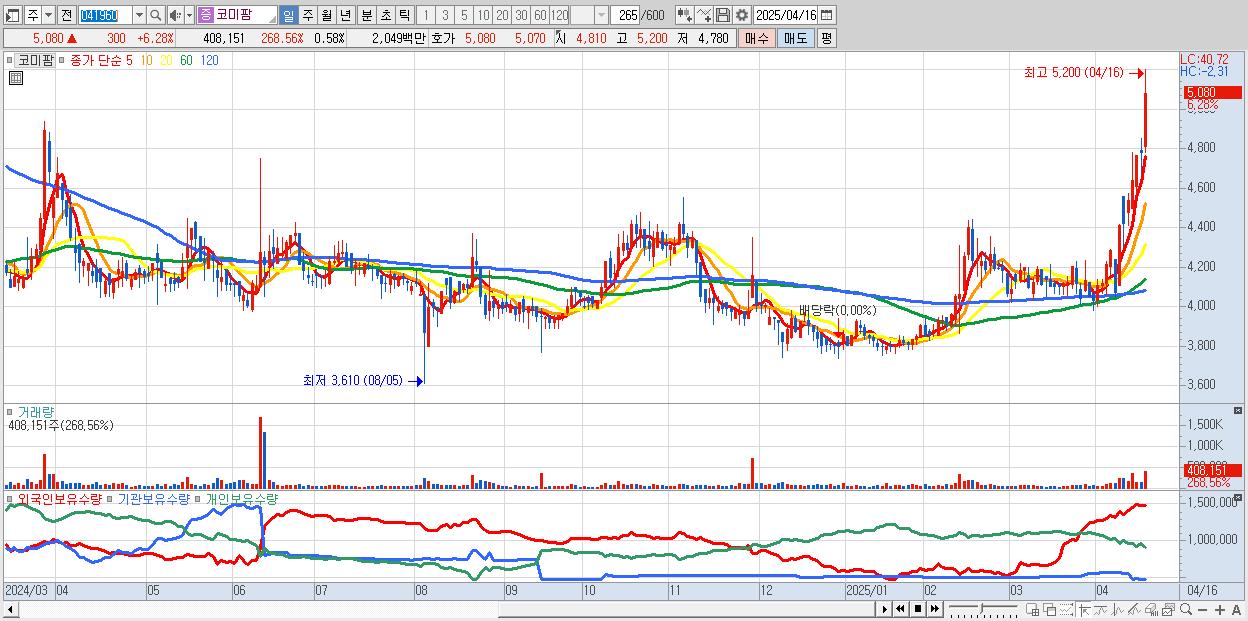 - 코미팜 (5,080원 ▲ 6.28% , 시총: 3,588억, 거래량: 408,151, 거래대금:20억, KOSDAQ)