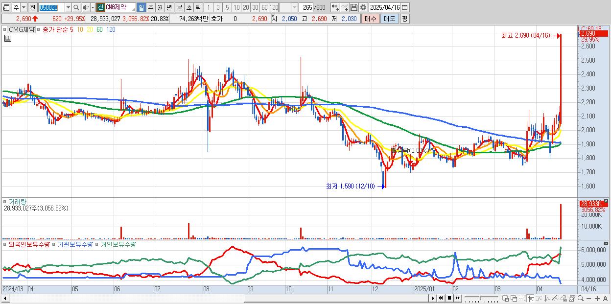 - CMG제약 (2,690원 ▲ 29.95% , 시총: 3,736억, 거래량: 28,933,027, 거래대금:743억, KOSDAQ)