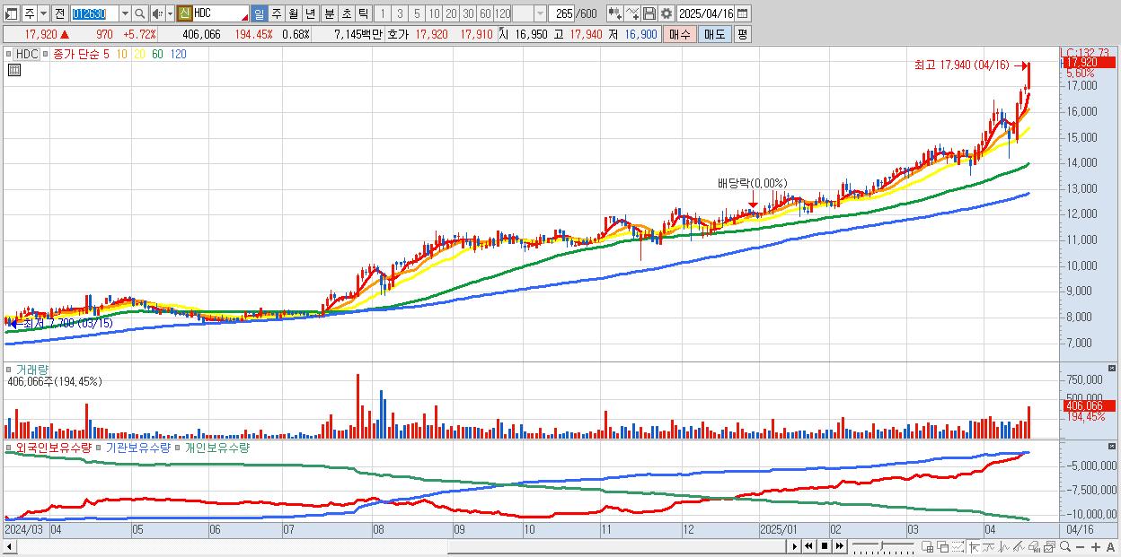 - HDC (17,840원 ▲ 5.25% , 시총: 10,658억, 거래량: 320,391, 거래대금:56억, KOSPI)