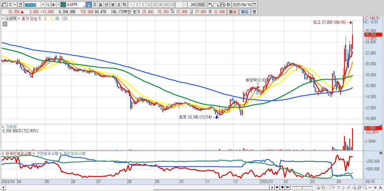 - 노바텍 (25,350원 ▲ 13.68% , 시총: 2,681억, 거래량: 6,394,986, 거래대금:1,662억, KOSDAQ)