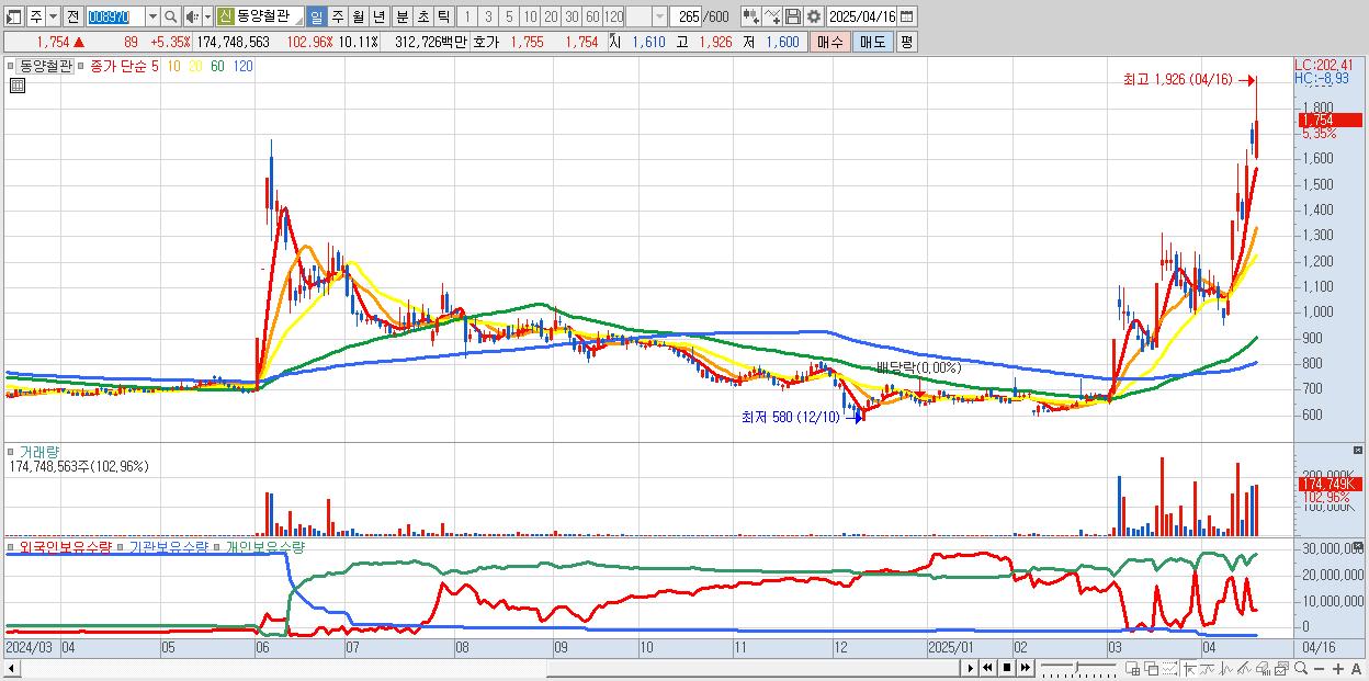 - 동양철관 (1,754원 ▲ 5.35% , 시총: 2,784억, 거래량: 174,748,563, 거래대금:3,127억, KOSPI)