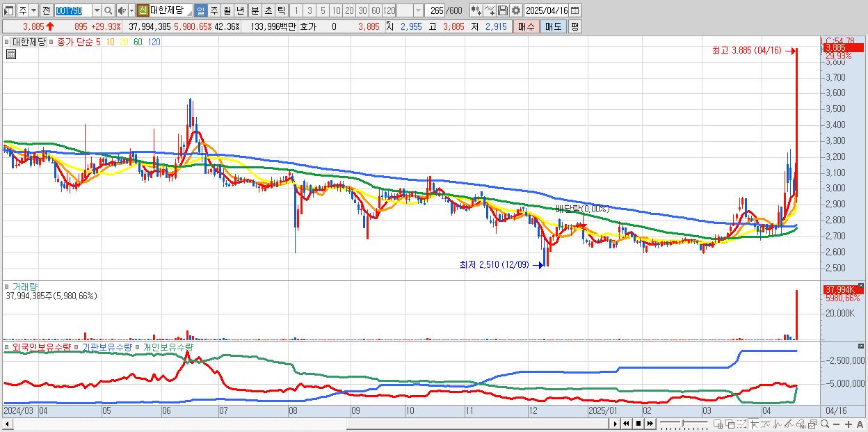 - 대한제당 (3,885원 ▲ 29.93% , 시총: 3,485억, 거래량: 37,994,385, 거래대금:1,340억, KOSPI)