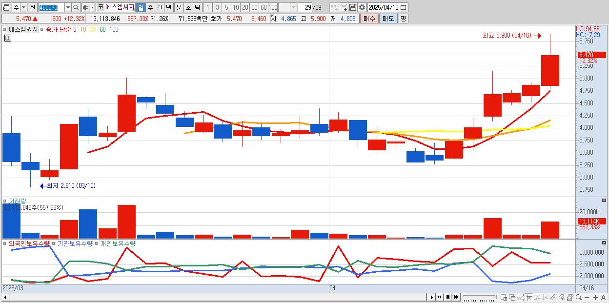 - 에스엠씨지 (5,470원 ▲ 12.32% , 시총: 1,007억, 거래량: 13,113,846, 거래대금:715억, KOSDAQ)