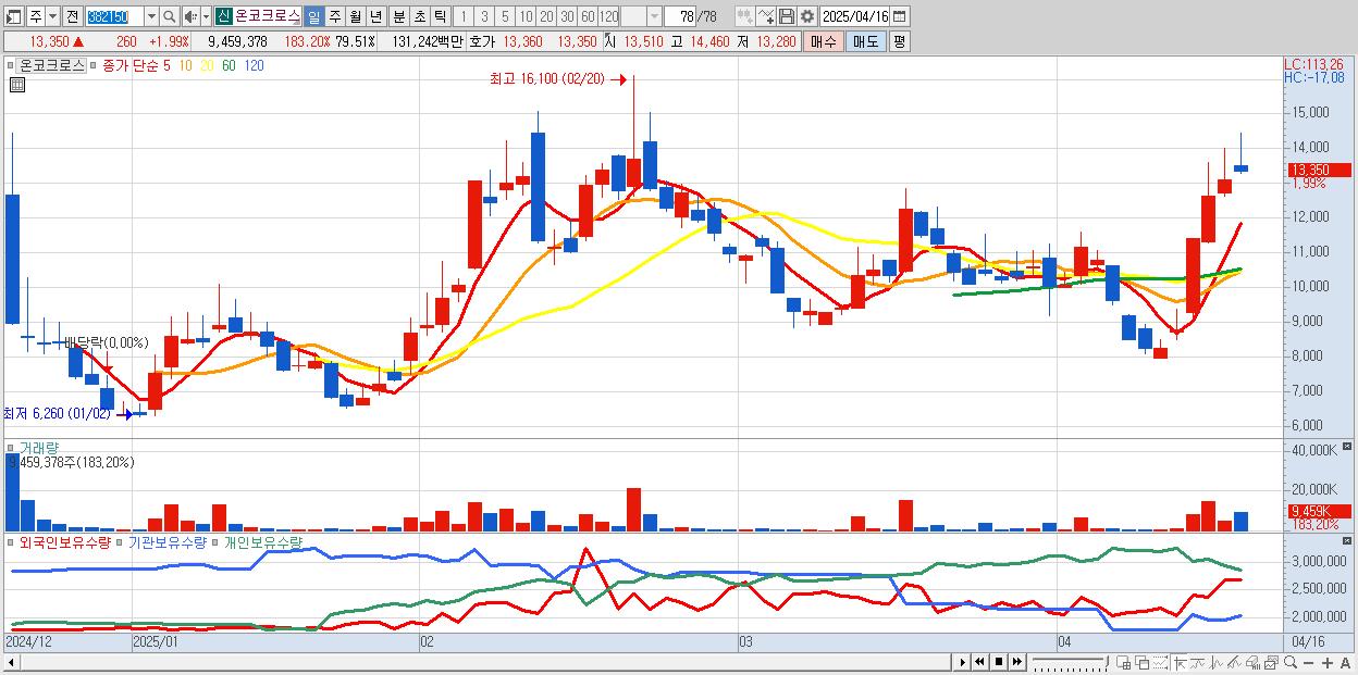 - 온코크로스 (13,350원 ▲ 1.99% , 시총: 1,588억, 거래량: 9,459,378, 거래대금:1,312억)