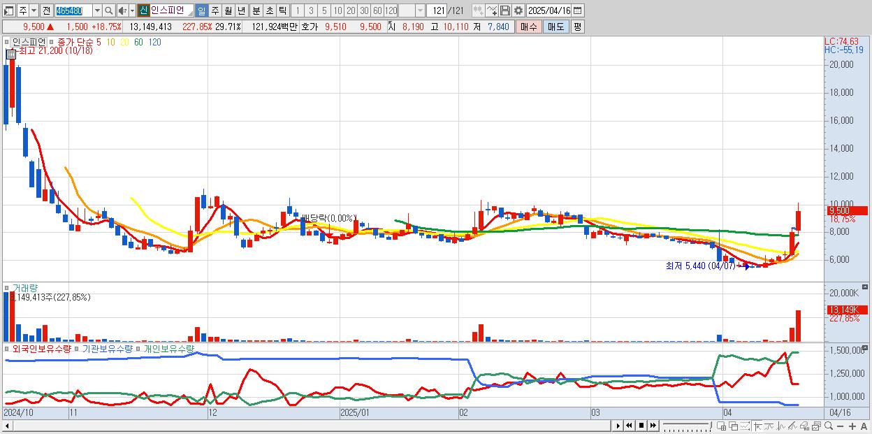 - 인스피언 (9,500원 ▲ 18.75% , 시총: 963억, 거래량: 13,149,413, 거래대금:1,219억)