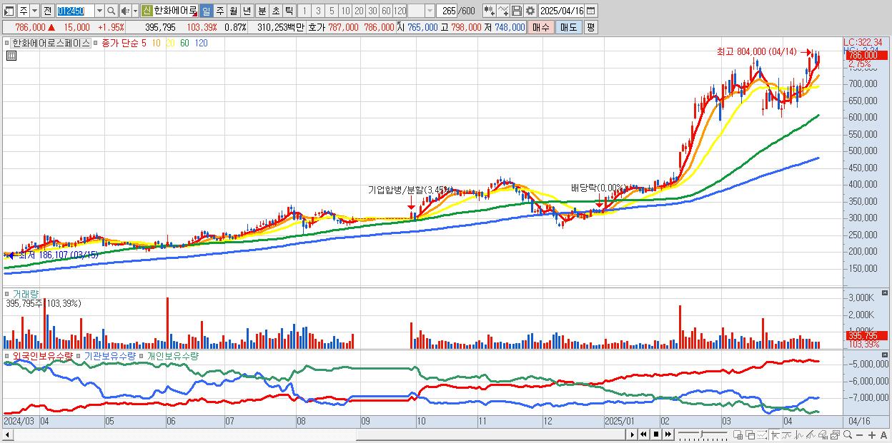 - 한화에어로스페이스 (788,000원 ▲ 2.2% , 시총: 359,180억, 거래량: 257,199, 거래대금:2,017억)