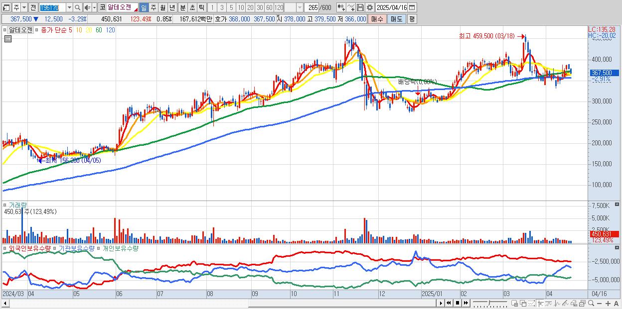 - 알테오젠 (366,500원 ▼ -3.55% , 시총: 195,414억, 거래량: 302,339, 거래대금:1,124억)
