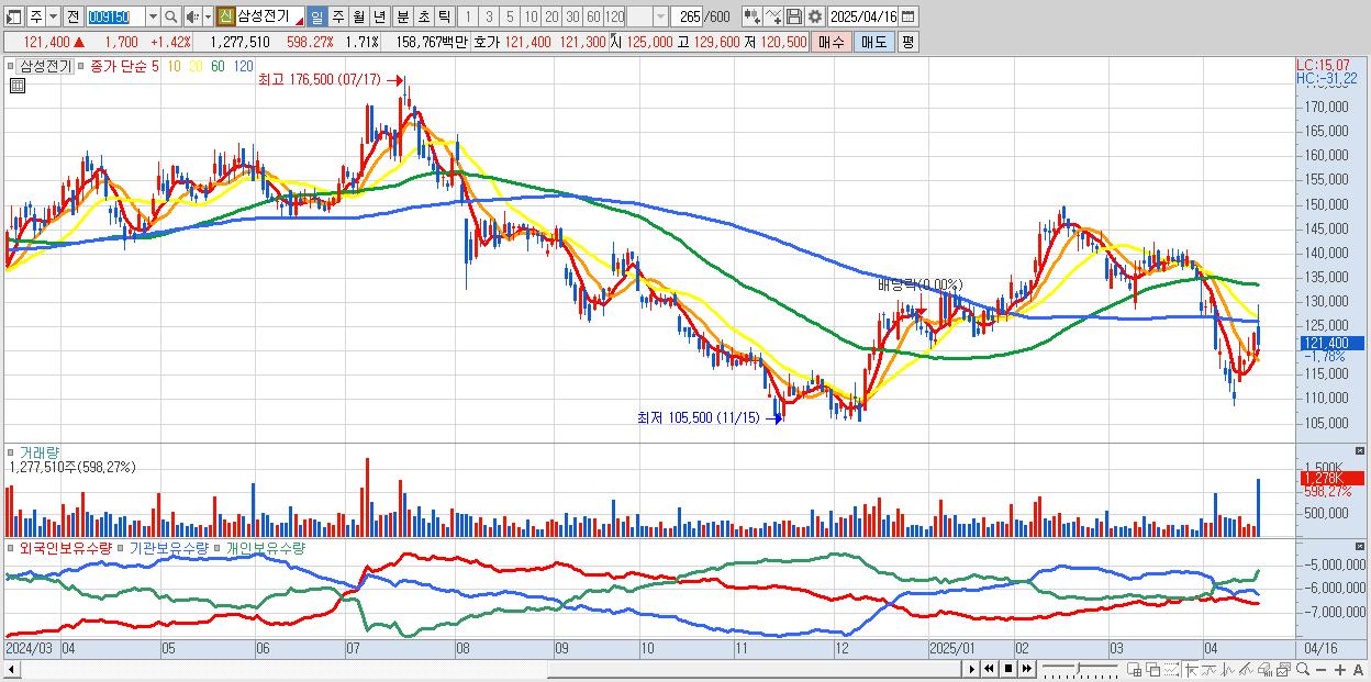 시총: 1,266,724억 거래량: 2,933,428 거래대금:5,136억 업종:전기·전자