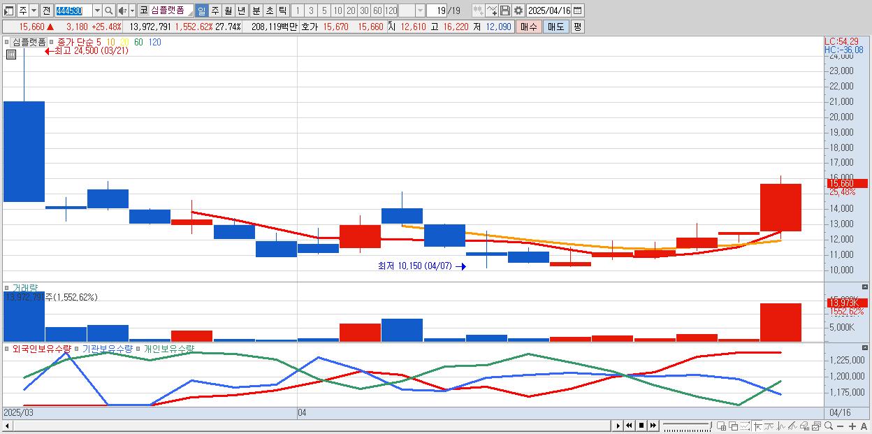 - 심플랫폼 (15,660원 ▲ 25.48% , 시총: 961억, 거래량: 13,972,791, 거래대금:2,081억)