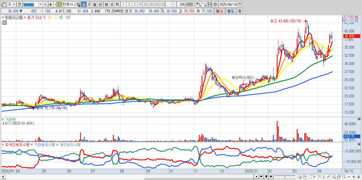 - 한화시스템 (38,350원 ▼ -1.29% , 시총: 72,451억, 거래량: 2,875,662, 거래대금:1,118억)