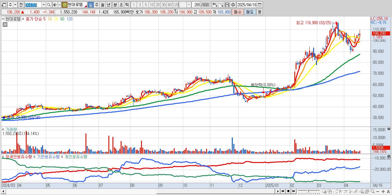 - 현대로템 (105,600원 ▲ 0.76% , 시총: 115,254억, 거래량: 1,147,808, 거래대금:1,228억)
