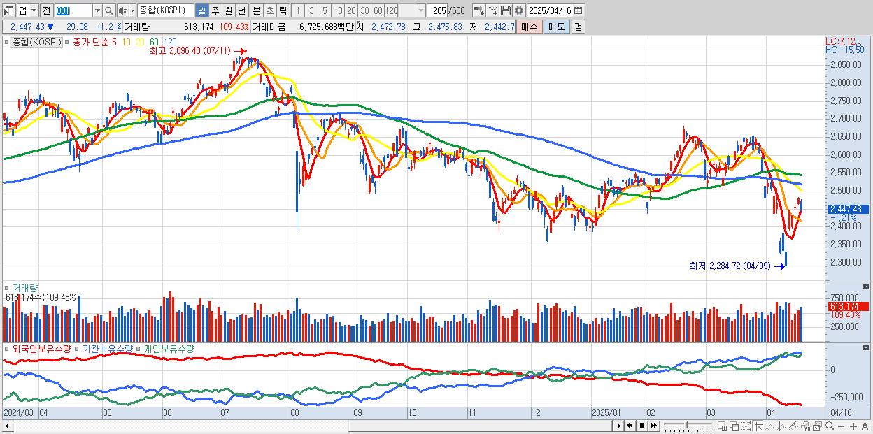 | 04/16 | 2,447.43 | ▼-1.21% | 3,835억 | -4,577억 | -153억 | 896억 |