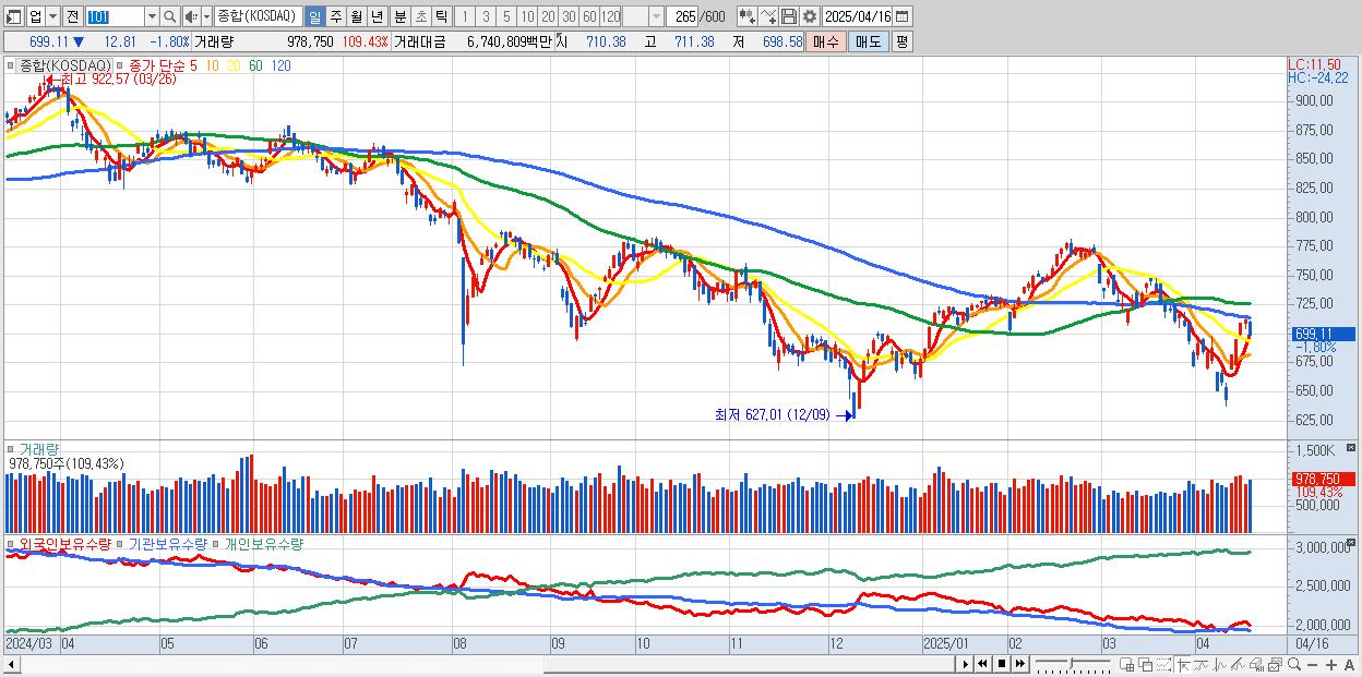 | 04/16 | 699.11 | ▼-1.80% | 2,321억 | -1,272억 | -967억 | -81억 |