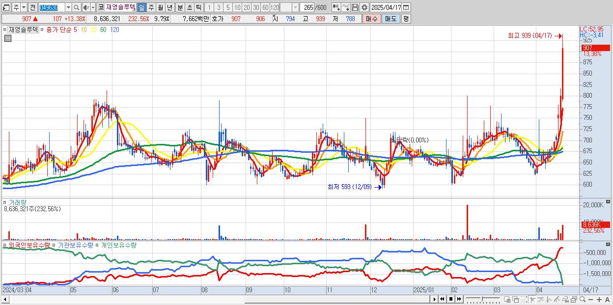 - 재영솔루텍 (907원 ▲ 13.38% , 시총: 800억, 거래량: 8,636,321, 거래대금:77억, KOSDAQ)