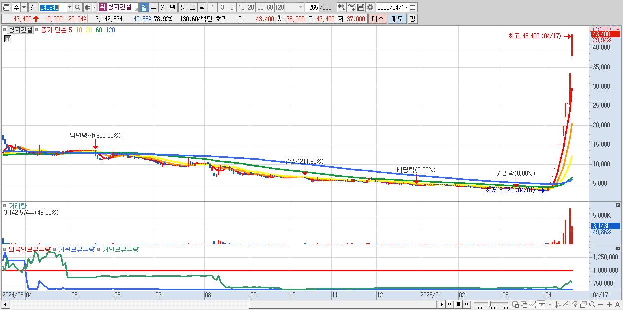 상지건설 43,400원 ▲ 29.94% (KOSDAQ, 042940)