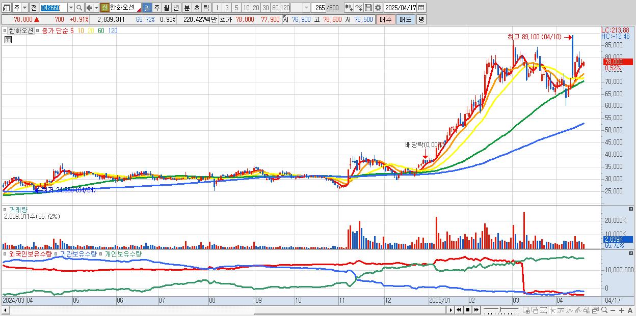 - 한화오션 (77,900원 ▲ 0.78% , 시총: 238,696억, 거래량: 1,479,940, 거래대금:1,149억)
