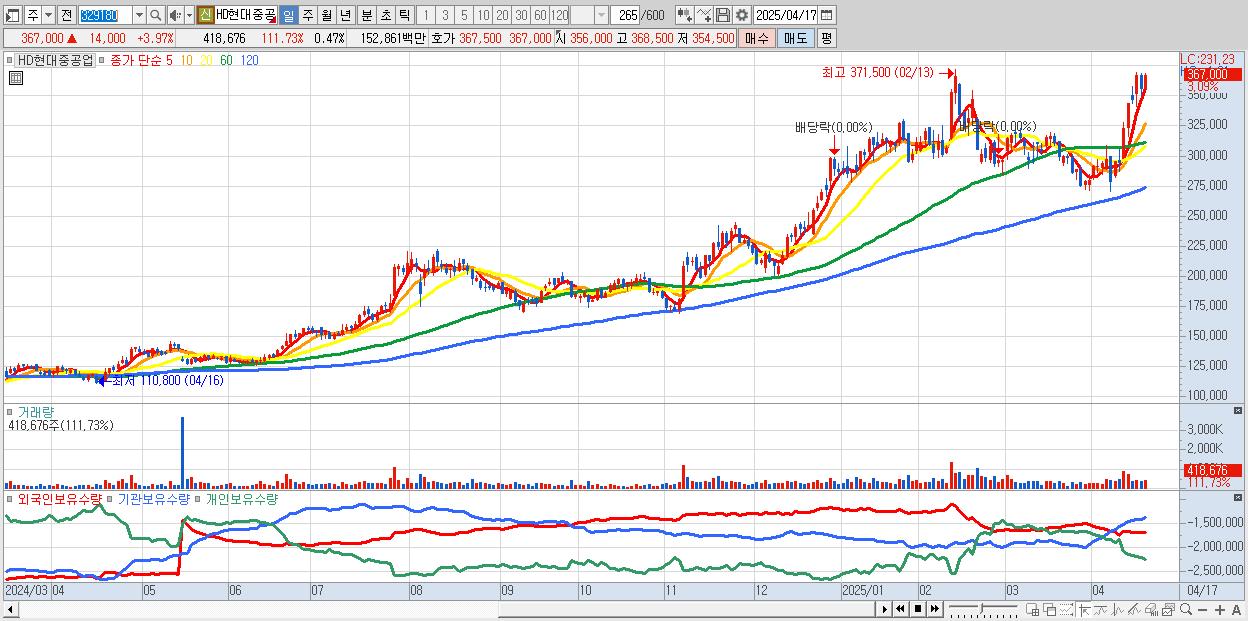 - HD현대중공업 (366,000원 ▲ 3.68% , 시총: 324,910억, 거래량: 285,662, 거래대금:1,044억)