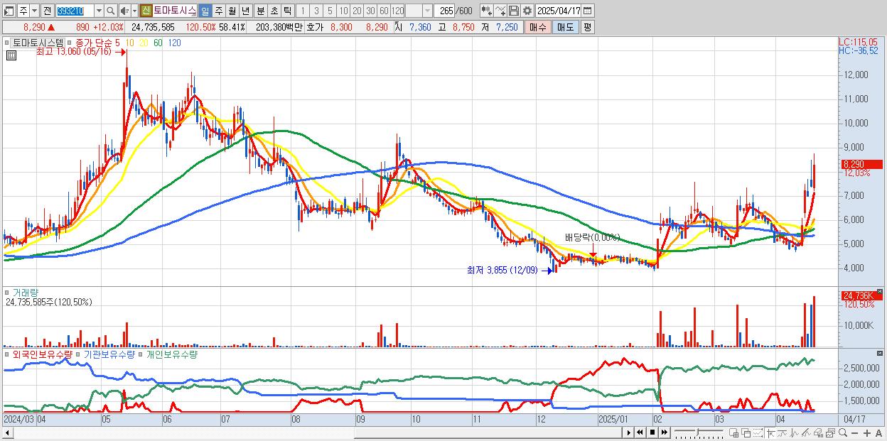 - 토마토시스템 (8,290원 ▲ 12.03% , 시총: 1,294억, 거래량: 24,735,585, 거래대금:2,034억)