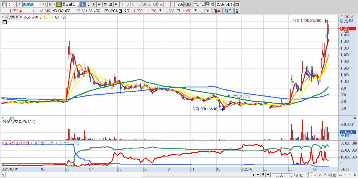 - 동양철관 (1,795원 ▲ 2.34% , 시총: 2,849억, 거래량: 99,062,856, 거래대금:1,784억)