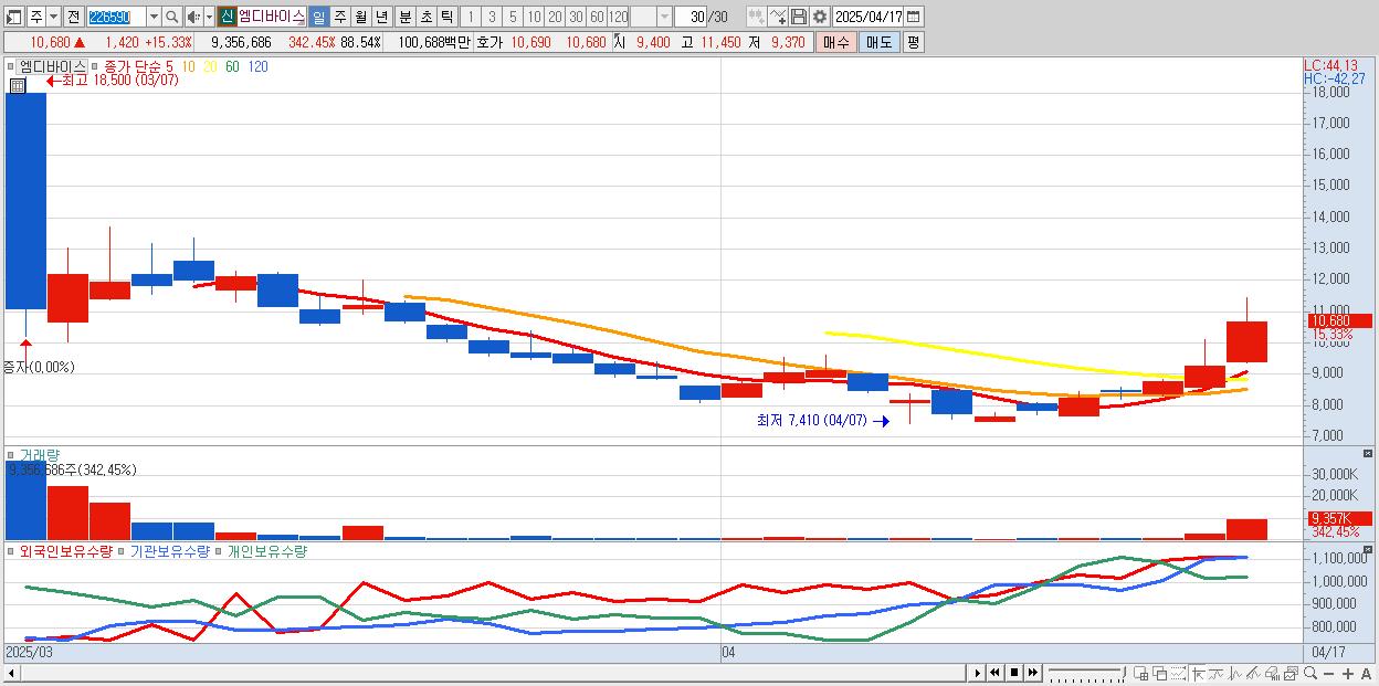 - 엠디바이스 (10,680원 ▲ 15.33% , 시총: 1,129억, 거래량: 9,356,686, 거래대금:1,007억)