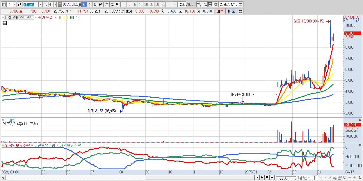 - DSC인베스트먼트 (9,300원 ▲ 3.33% , 시총: 2,557억, 거래량: 29,763,314, 거래대금:2,813억)