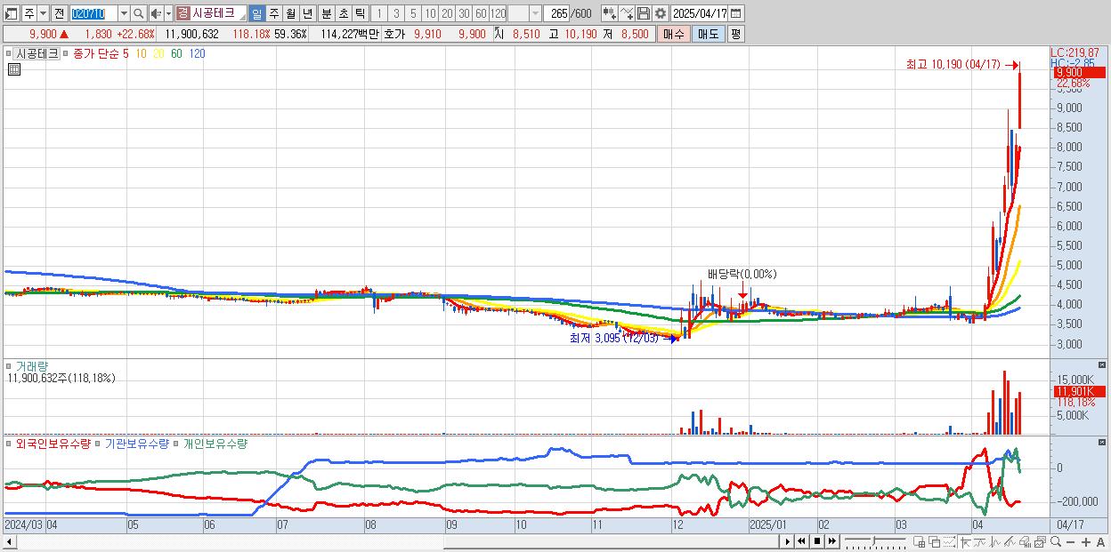 - 시공테크 (9,900원 ▲ 22.68% , 시총: 1,985억, 거래량: 11,900,632, 거래대금:1,142억)