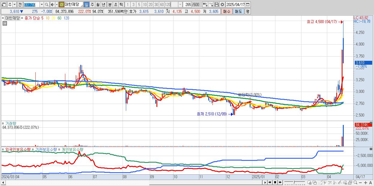 - 대한제당 (3,610원 ▼ -7.08% , 시총: 3,238억, 거래량: 84,373,896, 거래대금:3,516억)