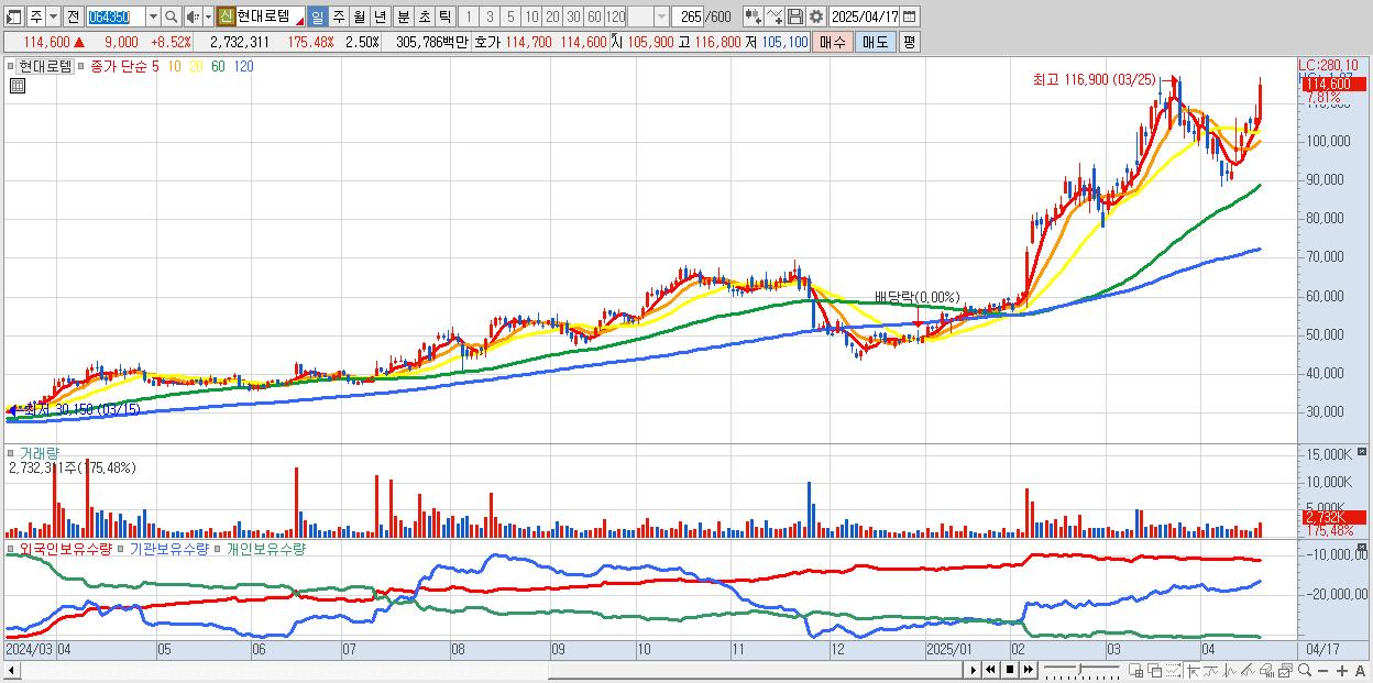 - 현대로템 (114,900원 ▲ 8.81% , 시총: 125,404억, 거래량: 1,912,310, 거래대금:2,140억)