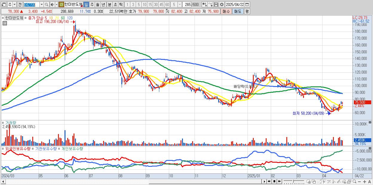 - 한미반도체 (74,900원 ▼ -0.27% , 시총: 72,364억, 거래량: 1,423,345, 거래대금:1,062억)