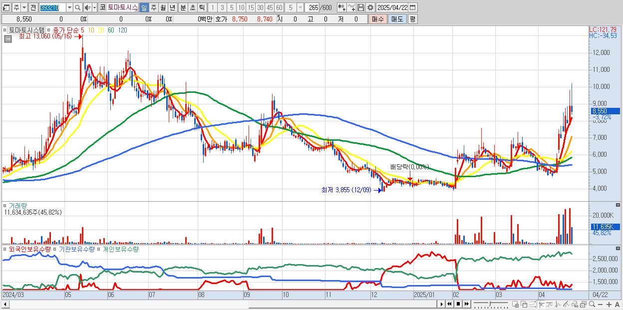 - 토마토시스템 (8,550원 ▼ -3.72% , 시총: 1,335억, 거래량: 11,634,635, 거래대금:1,081억)