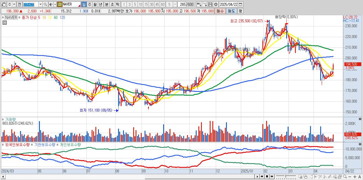 - NAVER (193,700원 ▲ 3.31% , 시총: 306,892억, 거래량: 645,159, 거래대금:1,247억)