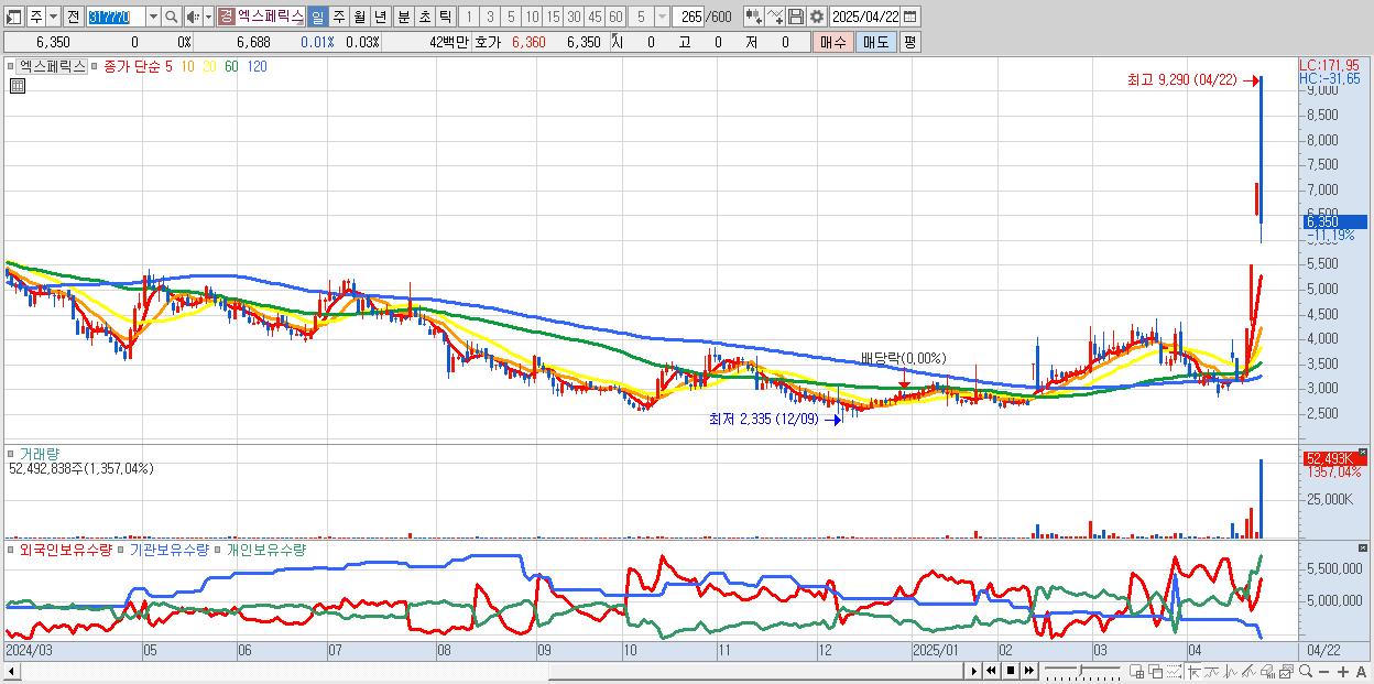 - 엑스페릭스 (6,350원 ▼ -11.19% , 시총: 1,610억, 거래량: 52,492,838, 거래대금:3,854억)