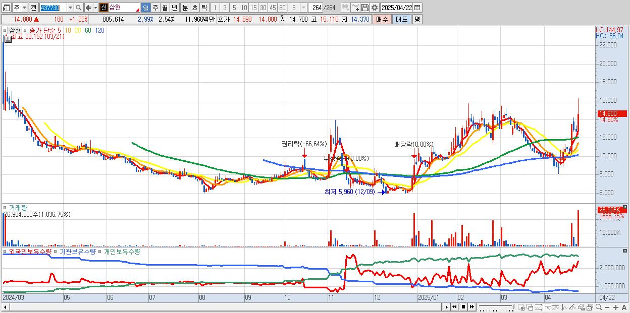 - 삼현 (14,700원 ▲ 14.04% , 시총: 4,661억, 거래량: 16,254,827, 거래대금:2,428억)