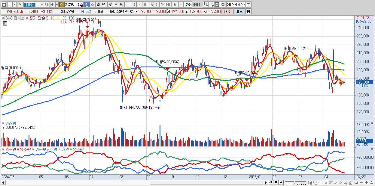 - SK하이닉스 (173,800원 ▼ -1.59% , 시총: 1,265,268억, 거래량: 2,008,388, 거래대금:3,501억)