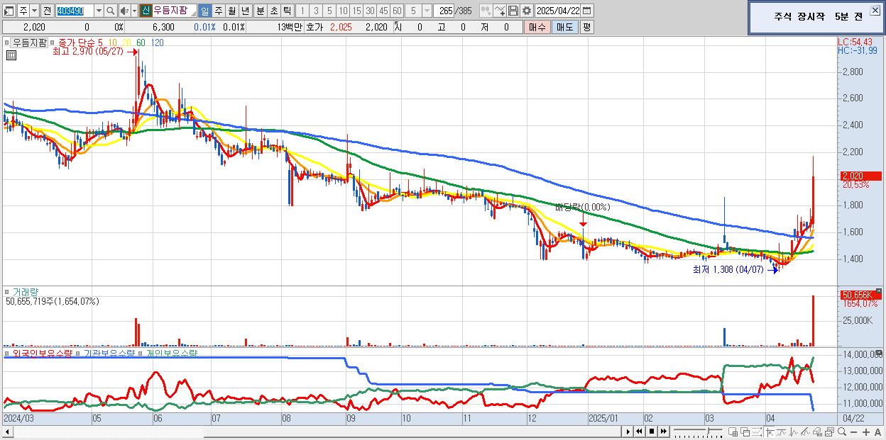 - 우듬지팜 (2,020원 ▲ 20.53% , 시총: 913억, 거래량: 50,655,719, 거래대금:1,009억)