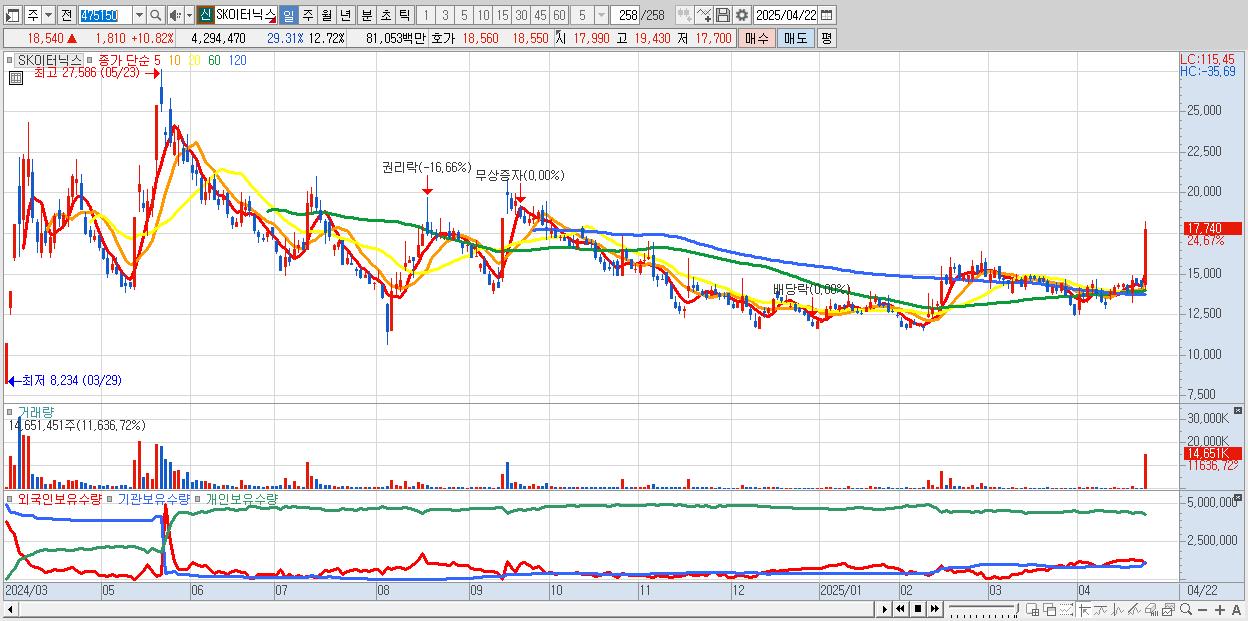 - SK이터닉스 (16,730원 ▲ 17.32% , 시총: 5,647억, 거래량: 6,494,952, 거래대금:1,046억)
