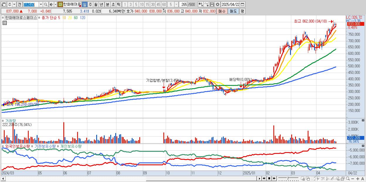 - 한화에어로스페이스 (830,000원 0% , 시총: 378,324억, 거래량: 151,172, 거래대금:1,261억)