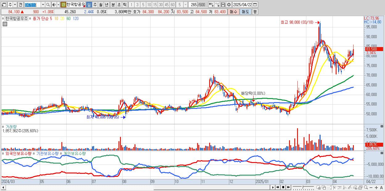 - 한국항공우주 (83,200원 ▲ 3.35% , 시총: 81,099억, 거래량: 1,253,139, 거래대금:1,048억)