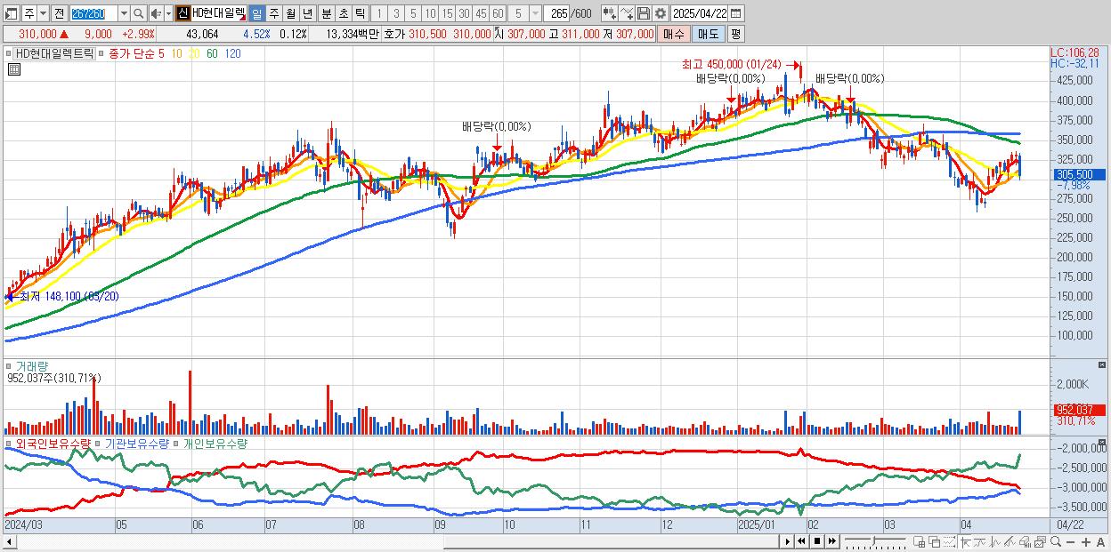 - HD현대일렉트릭 (301,000원 ▼ -9.75% , 시총: 108,502억, 거래량: 706,084, 거래대금:2,217억)