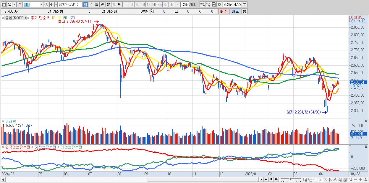 | 04/22 | 2,486.64 | ▼-0.07% | 1,667억 | -2,430억 | 107억 | 656억 |