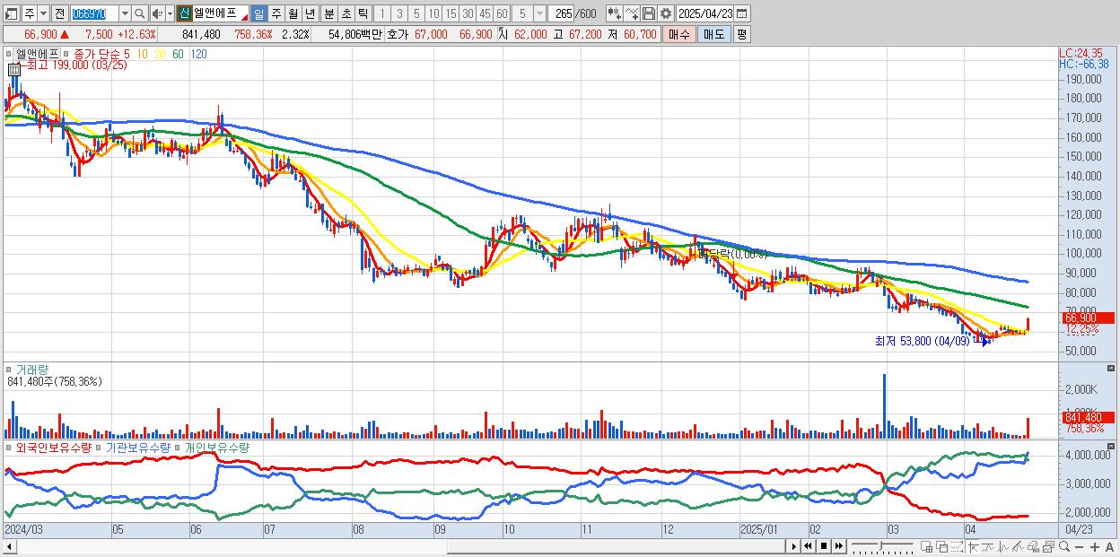 - 엘앤에프 (66,700원 ▲ 12.29% , 시총: 24,210억, 거래량: 620,208, 거래대금:404억)