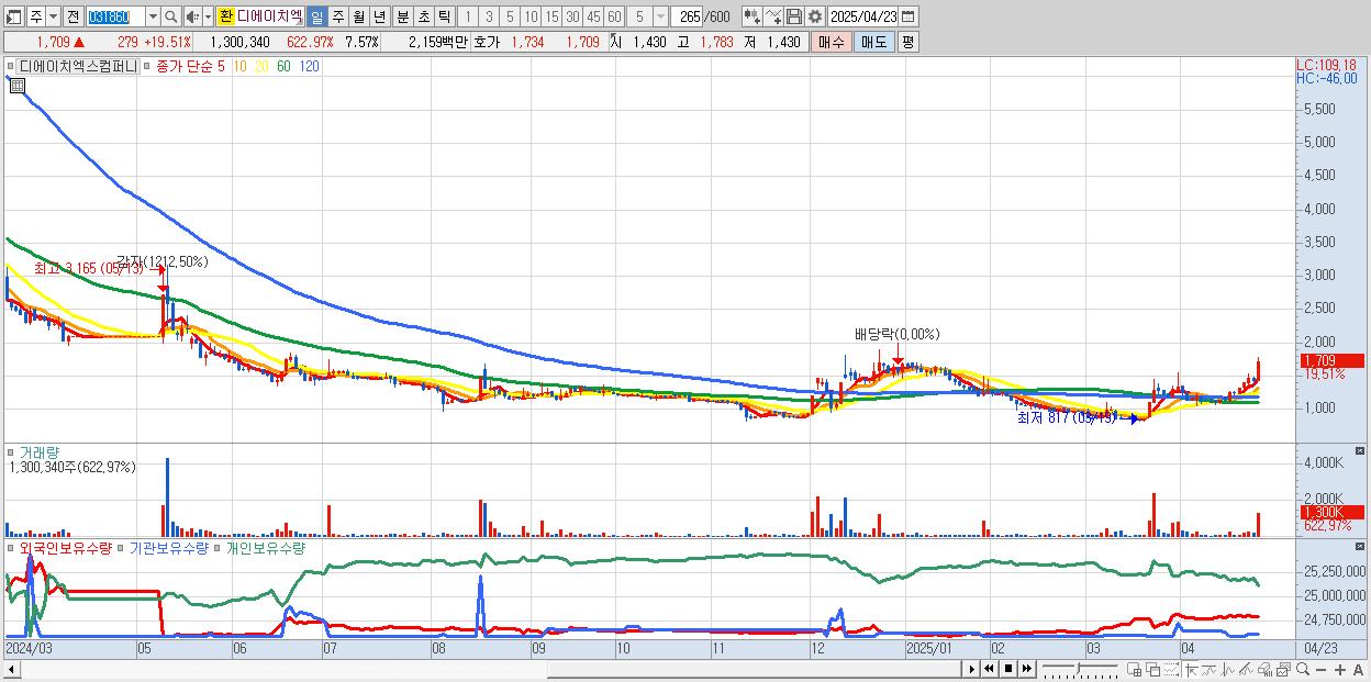- 디에이치엑스컴퍼니 (1,709원 ▲ 19.51% , 시총: 293억, 거래량: 1,300,340, 거래대금:22억)