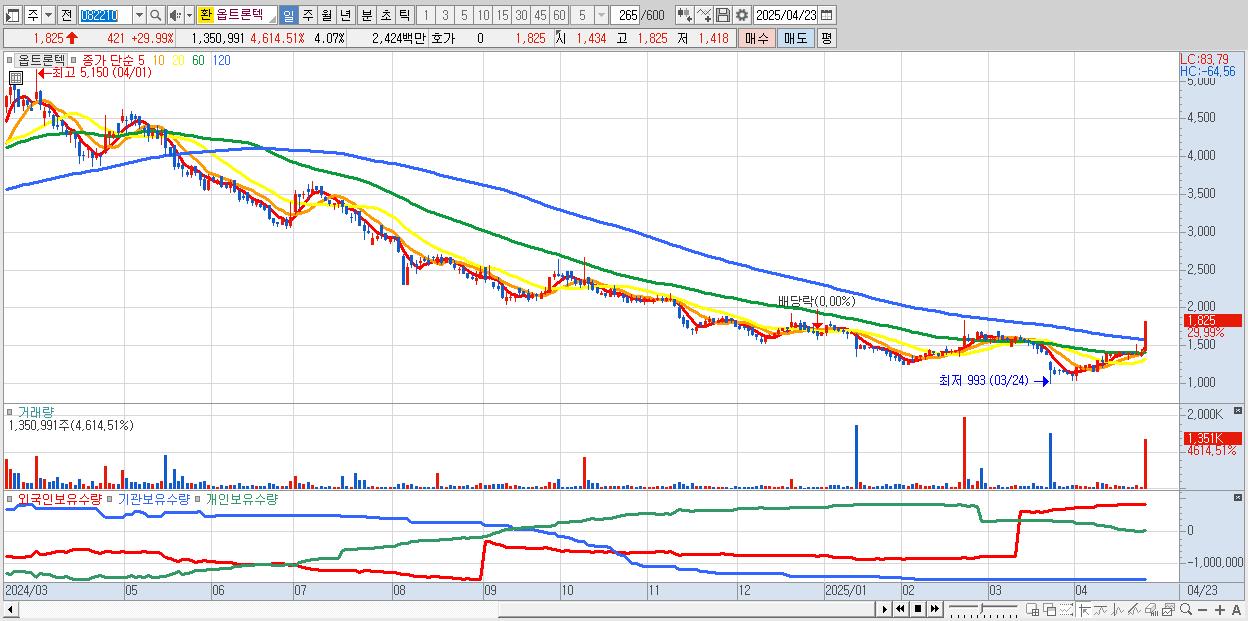 - 옵트론텍 (1,825원 ▲ 29.99% , 시총: 606억, 거래량: 1,350,991, 거래대금:24억)
