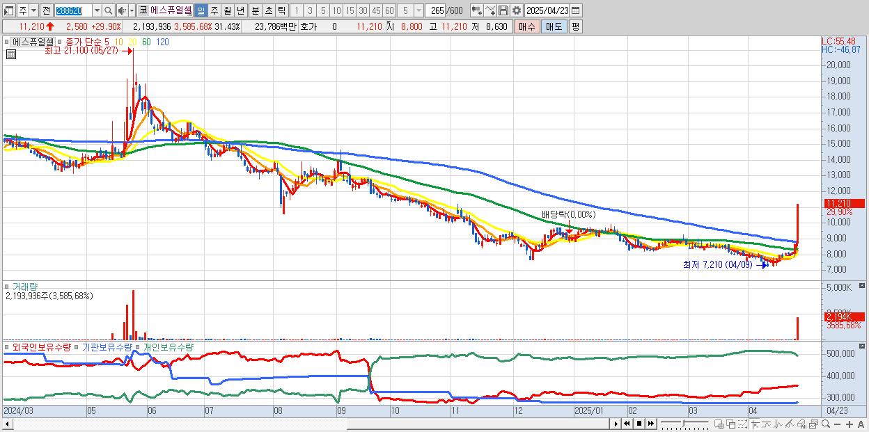 - 에스퓨얼셀 (11,210원 ▲ 29.9% , 시총: 782억, 거래량: 2,193,936, 거래대금:238억)