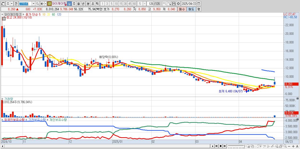 - 와이제이링크 (8,540원 ▲ 11.49% , 시총: 1,215억, 거래량: 4,023,391, 거래대금:382억)
