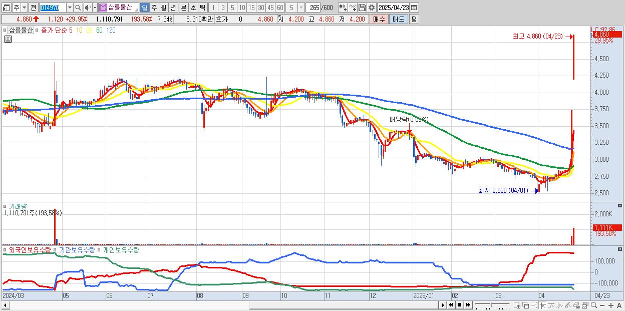 - 삼륭물산 (4,860원 ▲ 29.95% , 시총: 735억, 거래량: 1,110,791, 거래대금:53억)