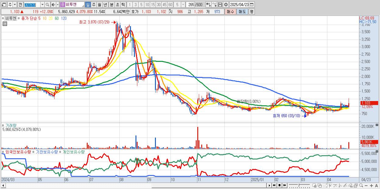 - 비투엔 (1,103원 ▲ 12.09% , 시총: 560억, 거래량: 5,860,629, 거래대금:66억)