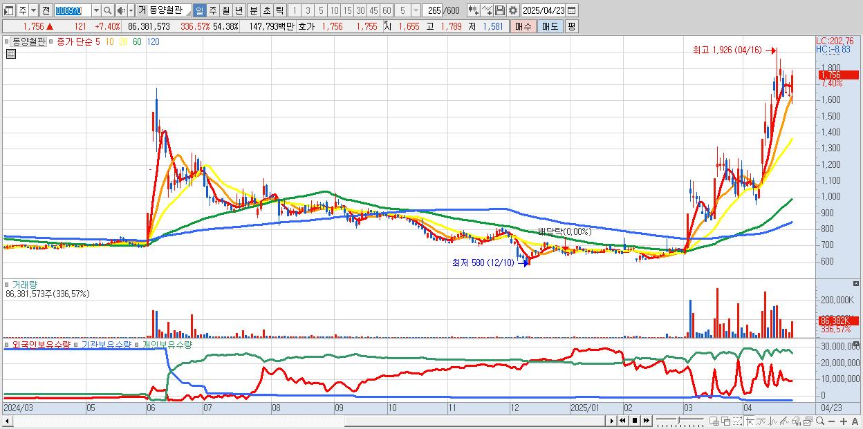 - 동양철관 (1,756원 ▲ 7.4% , 시총: 2,789억, 거래량: 86,381,573, 거래대금:1,478억)