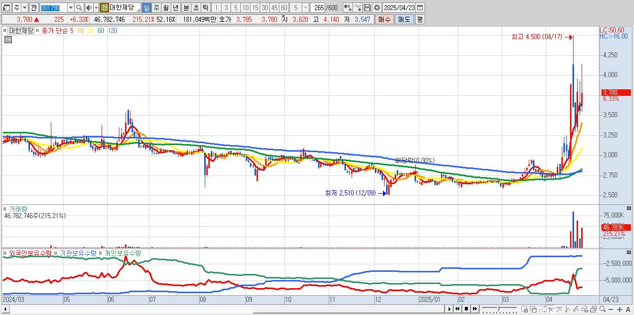- 대한제당 (3,780원 ▲ 6.33% , 시총: 3,391억, 거래량: 46,782,746, 거래대금:1,810억)